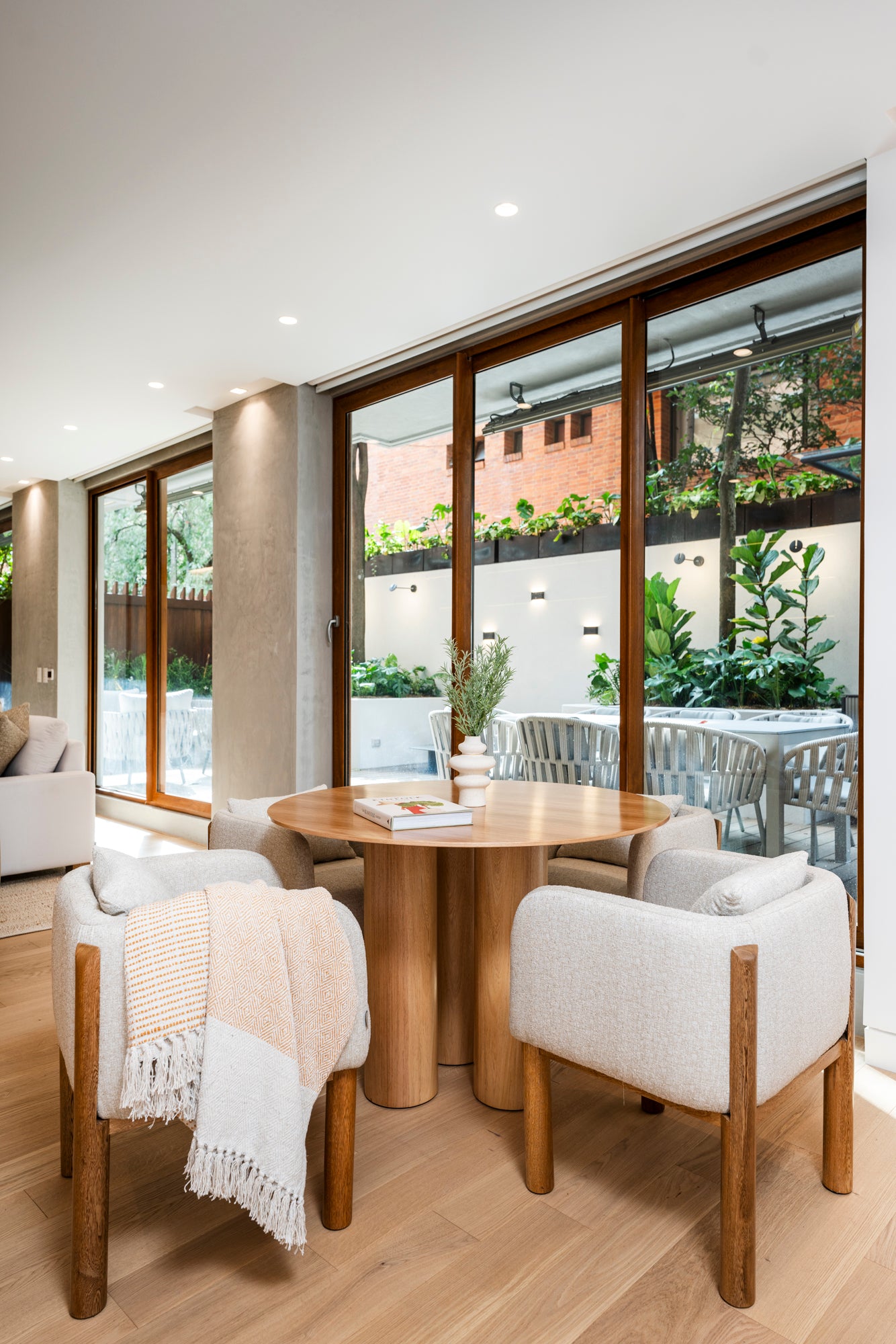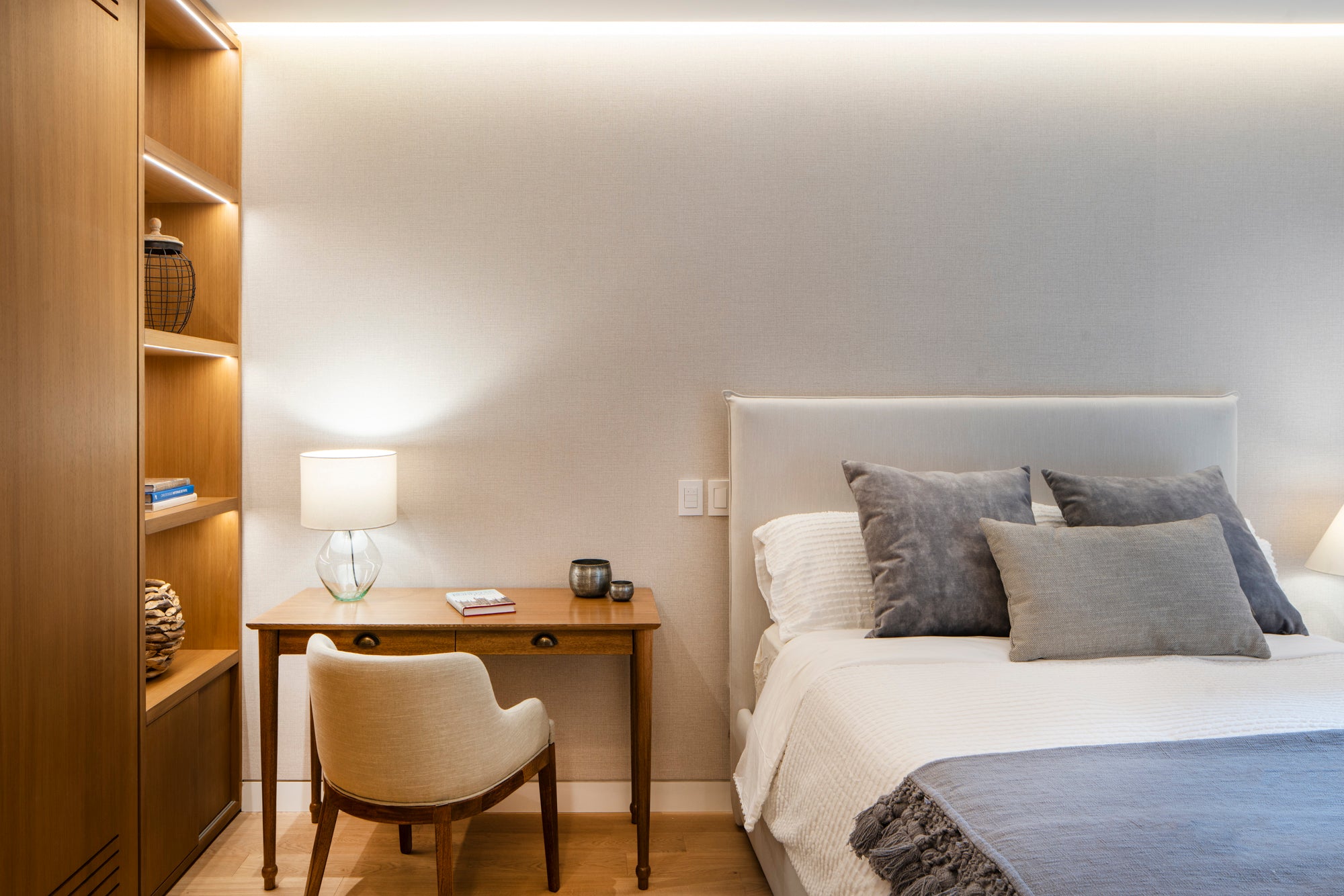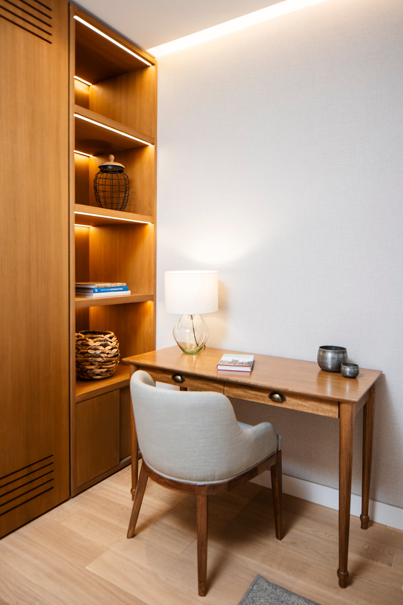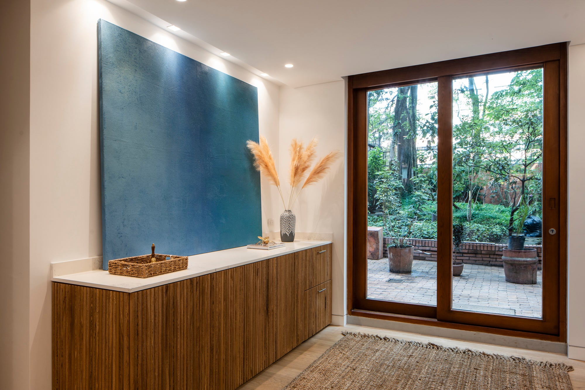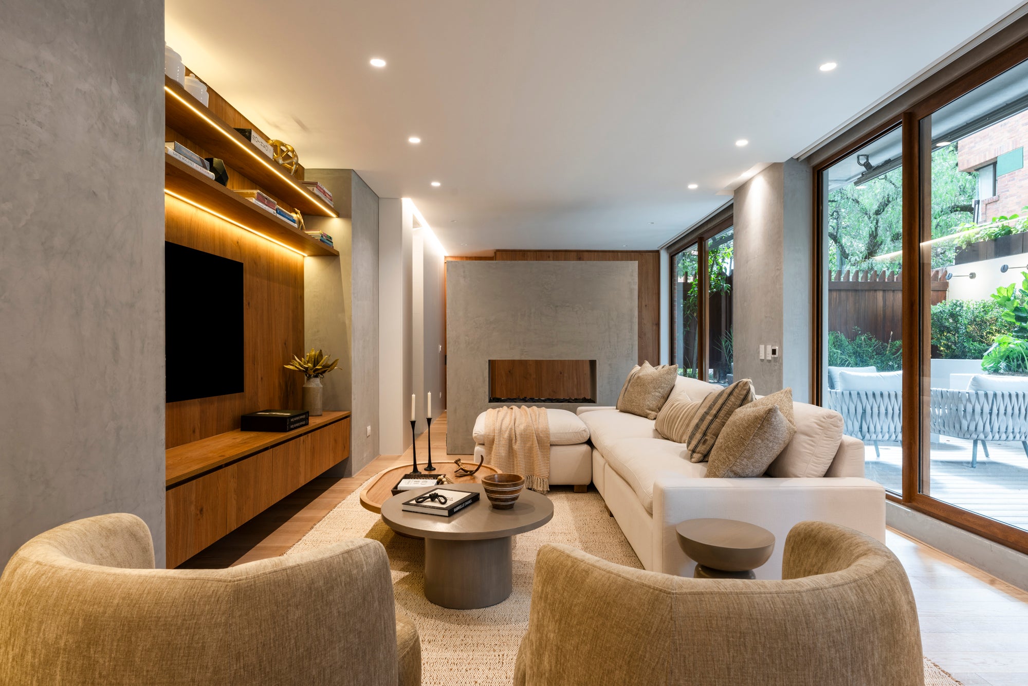 La sala, eje estético del proyecto, destaca por su atmósfera “moody” lograda con tonos oscuros y piezas personalizadas. Entre el diseño, una imponente biblioteca en madera flor morado, iluminada para enmarcar la colección musical del cliente, y una cava de vinos sobre una pared revestida en madera gris plomo.