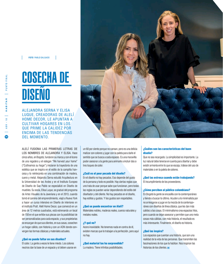 Alelí Home Decor lleva 12 años en el mundo del diseño interior en Colombia, generando bienestar a través de espacios cuidadosamente curados, en los cuales la sofisticación descomplicada se destaca y deja su sello. Reviven el patrimonio artesanal y los oficios tradicionales a través de sus diseños, incorporando cestería, tejeduría, costura a mano, ornamentación o ebanistería en sus creaciones.