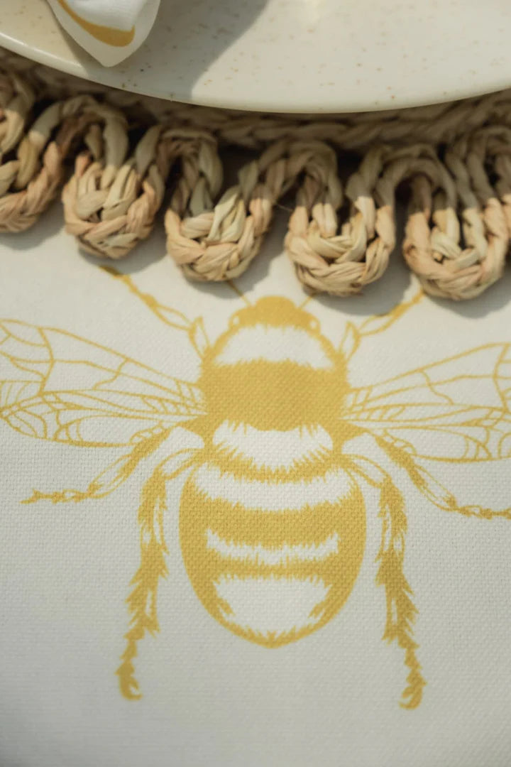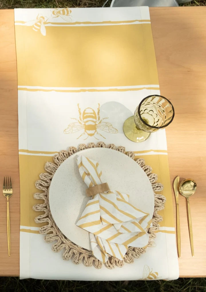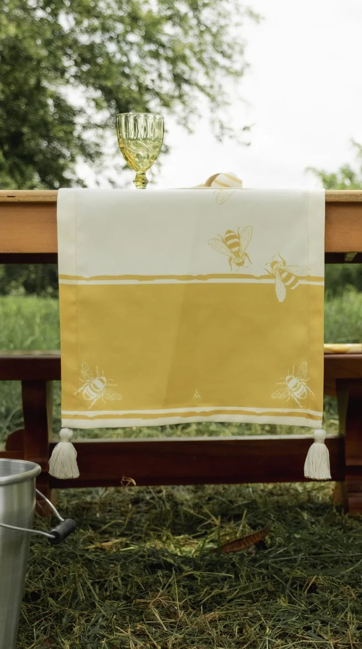 Camino de Mesa Antifluídos. Confeccionado en poliéster con recubrimiento de Scotch Guard. Incluye borlas removibles en las esquinas.