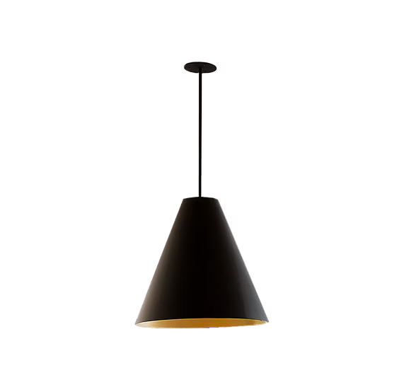 Lámpara colgante de diseño contemporáneo con estructura cónica en metal negro y acabado dorado en su interior. Esta pieza combina elegancia minimalista con calidez, creando un contraste visual sofisticado que realza cualquier espacio. Ideal para comedores, salas de estar o áreas de trabajo que demanden iluminación funcional con presencia estética. Su geometría pura y materiales de calidad la convierten en un elemento decorativo versátil que complementa tanto estilos modernos como transicionales.