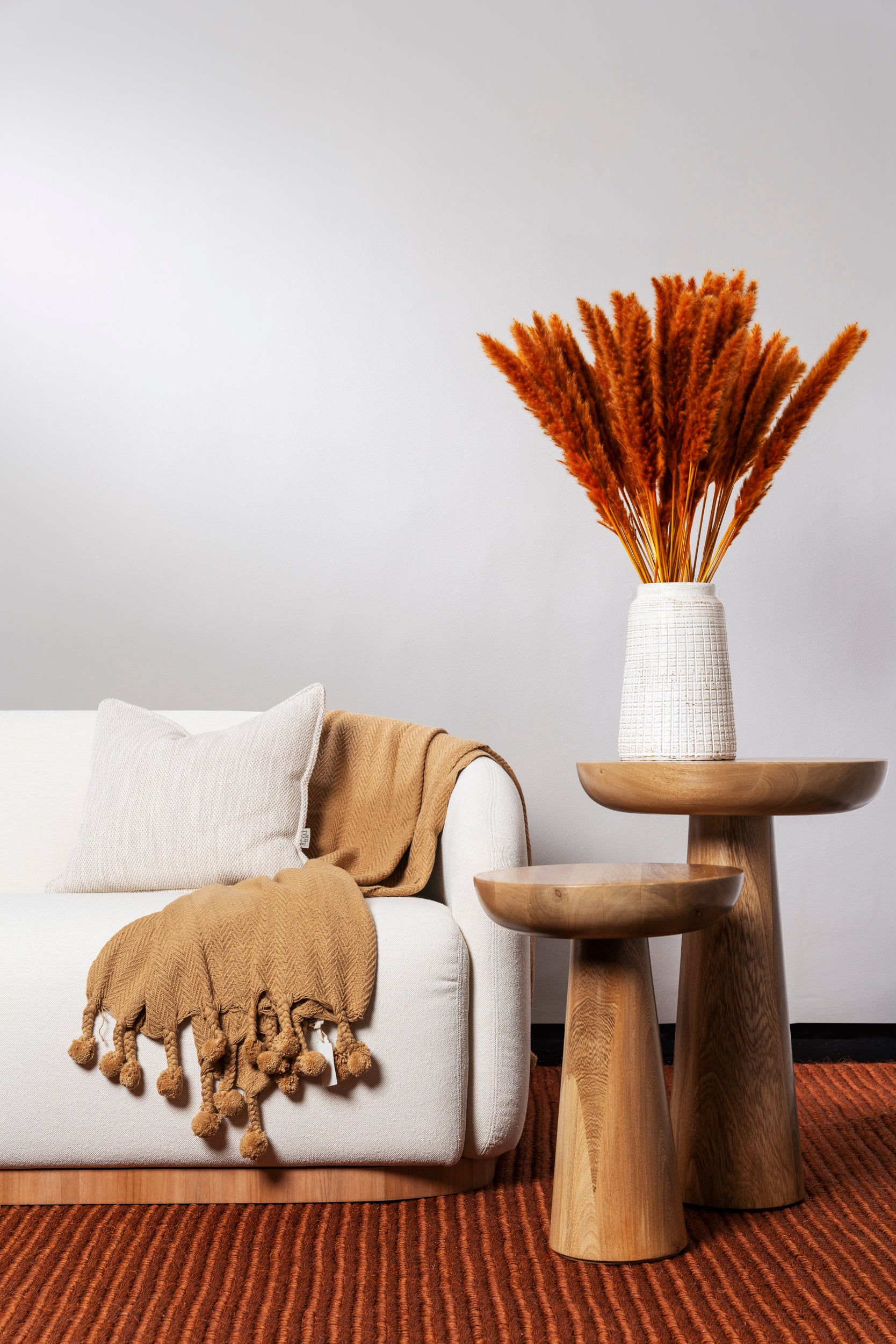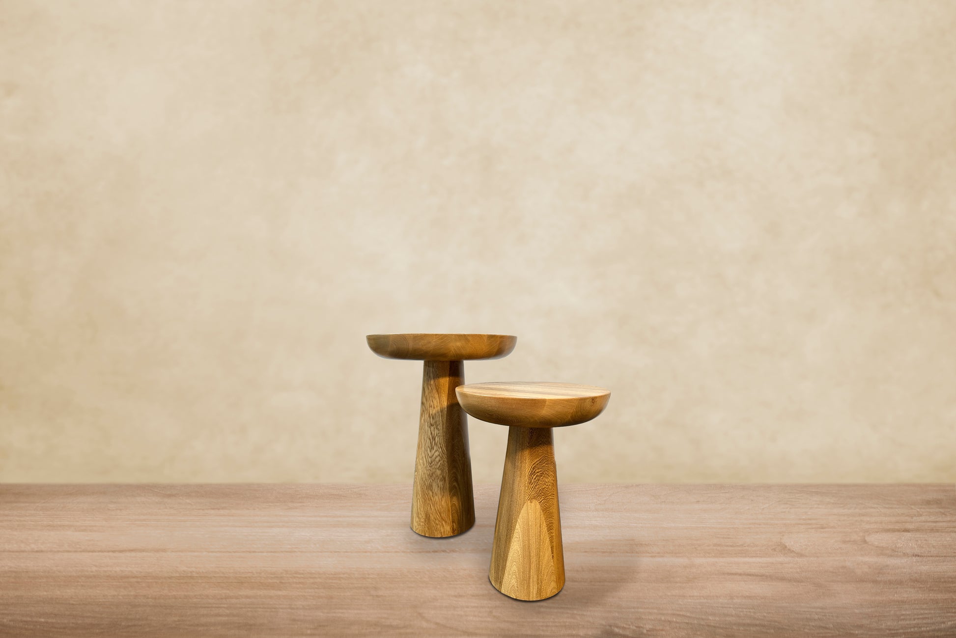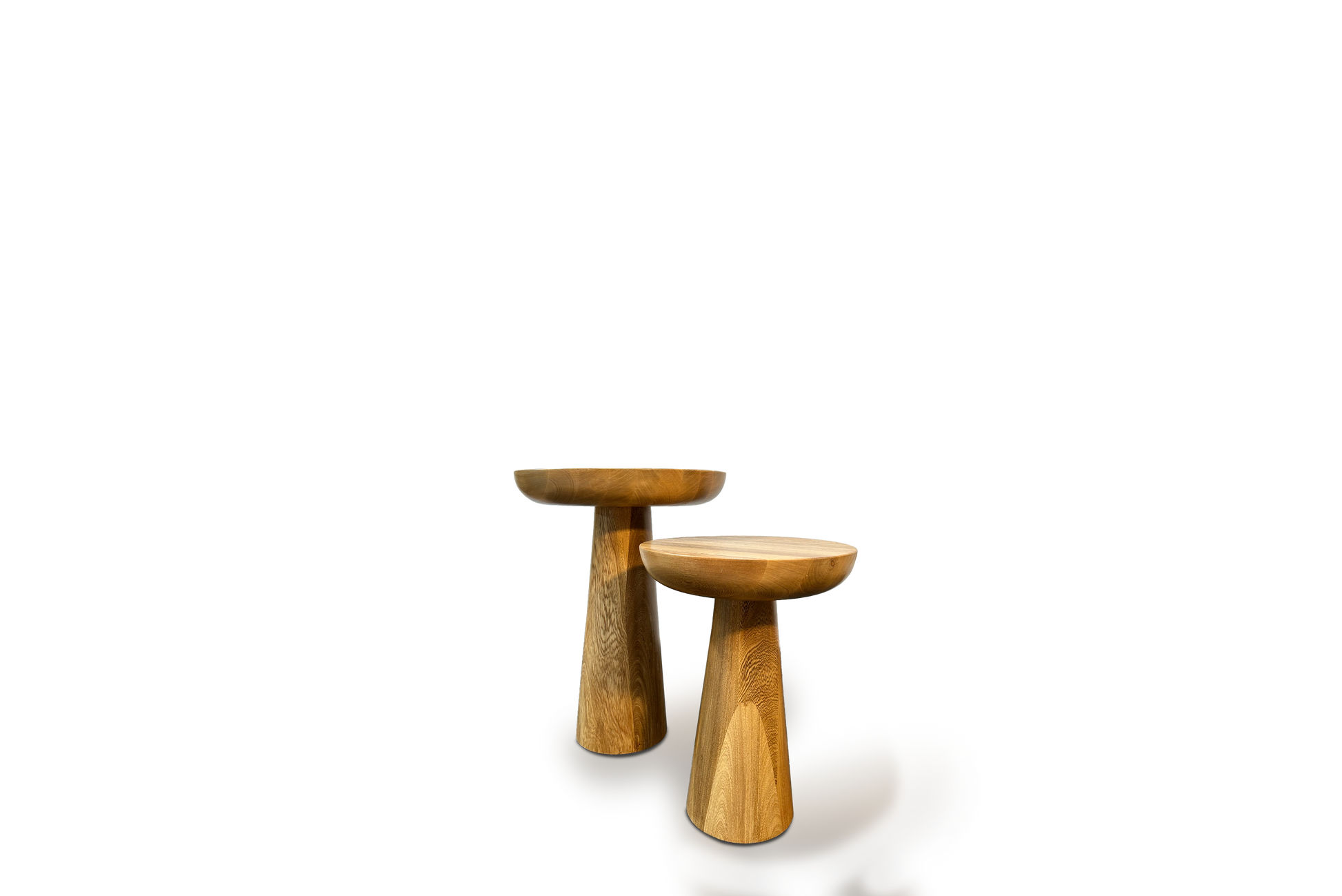 Mesas auxiliares torneadas en madera flormorado tono natural.